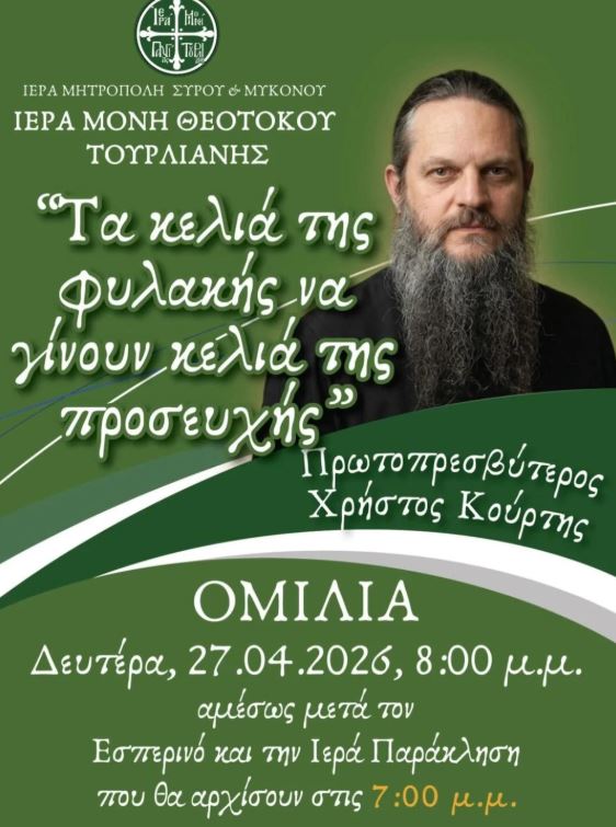 Μια πνευματική συνάντηση με έντονο κοινωνικό και εκκλησιαστικό ενδιαφέρον προγραμματίζεται για τη Δευτέρα 27 Απριλίου 2026 στην Άνω Μερά της Μυκόνου, καθώς η Ιερά Μονή Παναγίας Τουρλιανής θα φιλοξενήσει ομιλία υπό την αιγίδα της Ιεράς Μητροπόλεως Σύρου και Μυκόνου. Η εκδήλωση φέρνει στο προσκήνιο ένα θέμα με βαρύ συμβολισμό, που αγγίζει τη σχέση της πίστης με τον πόνο, τον περιορισμό και τη δυνατότητα εσωτερικής μεταστροφής.