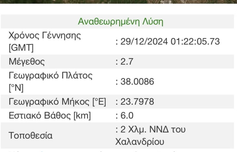 Ακολούθησε μια ώρα μετά, στις 4:47, σεισμός 1,9 Ρίχτερ με επίκεντρο 3 χλμ Νοτιοδυτικά του Χαλανδρίου και εστιακό βάθος στα 7,9 χλμ.