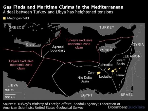 Η ανατολική Μεσόγειος έχει γίνει επίκεντρο για την παραγωγή ενέργειας, με την Κύπρο, το Ισραήλ και την Αίγυπτο να ανακοινώνουν τεράστια κοιτάσματα τα τελευταία χρόνια και την Τουρκία να πιέζει να εξασφαλίσει ένα μερίδιο των πόρων, ενώ την ίδια ώρα αψηφά τις προειδοποιήσεις της Ευρωπαϊκής Ένωσης ότι οι μονομερείς ενέργειές της σε εδαφικές διαφορές με την Ελλάδα και την Κύπρο θα μπορούσαν να επιδεινώσουν περαιτέρω τις σχέσεις, γράφει χαρακτηριστικά το Bloomberg.
