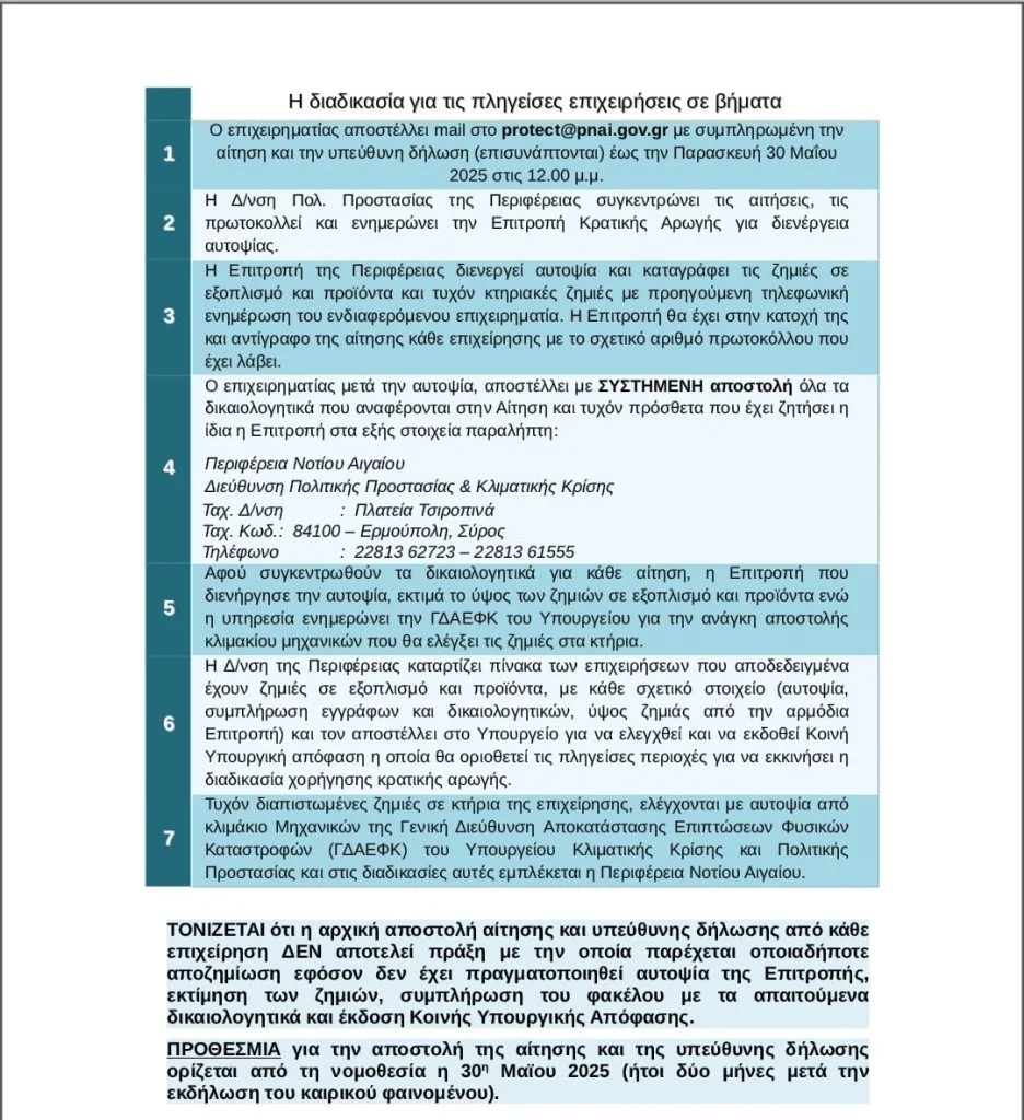 Η Διεύθυνση Πολιτικής Προστασίας και Κλιματικής Κρίσης της Περιφέρειας Νοτίου Αιγαίου ενημερώνει τους ενδιαφερόμενους επιχειρηματίες, των οποίων οι επιχειρήσεις έχουν πληγεί από τα πλημμυρικά φαινόμενα της 31ης Μαρτίου 2025 στα νησιά Πάρου και Μυκόνου, ότι εκκινεί η διαδικασία αιτήσεων για διενέργεια αυτοψίας από την προβλεπόμενη Επιτροπή Κρατικής Αρωγής της Περιφέρειας με σκοπό να πιστοποιηθούν οι ζημιές σε εξοπλισμό – προϊόντα – εγκαταστάσεις και να συγκεντρωθούν τα απαιτούμενα δικαιολογητικά που θα αποσταλούν στο Υπουργείο Κλιματικής Κρίσης και Πολιτικής Προστασίας προκειμένου να εκδοθεί Κοινή Υπουργική Απόφαση οριοθέτησης των πληγεισών περιοχών για την παροχή των προβλεπόμενων από την νομοθεσία αποζημιώσεων.