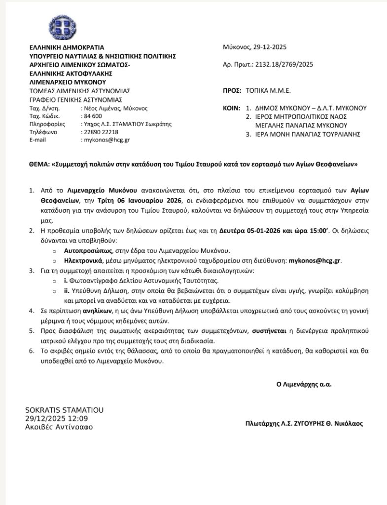 Μύκονος Ανακοίνωση του ΔΛΤ Μυκόνου για την συμμετοχή στα Θεοφάνεια Date: 29 Δεκεμβρίου, 2025 Εξέδωσε ανακοίνωση το Δημοτικό Λιμενικό Ταμείο Μυκόνου σχετικά με την συμμετοχή πολιτών στην κατάδυση του Τιμίου Σταυρού κατά τον εορτασμό των Αγίων Θεοφανείων. ΔΙΑΒΑΣΤΕ ΕΠΙΣΗΣ ΜΥΚΟΝΟΣ Ο καιρός στη Μύκονο: Η πρόγνωση της Τρίτης Συννεφιασμένο αναμένεται το σκηνικό του καιρού στη Μύκονο για... ΕΠΙΧΕΙΡΗΣΕΙΣ Κυκλάδες: Έρχεται «κόφτης» έως 30% στις τουριστικές κλίνες και αυστηρό πλαίσιο για τα Airbnb Σε φάση τελικής επεξεργασίας βρίσκεται το νέο Ειδικό Χωροταξικό... Μύκονος Καιρός στη Μύκονο: Αναλυτική Πρόγνωση για τη Μεγάλη Τετάρτη 8 Απριλίου Με ανοιξιάτικο αλλά ελαφρώς άστατο σκηνικό συνεχίζεται η Μεγάλη... Ελλάδα Αποζημιώσεις για τη λειτουργία των παλιών εργοστασίων της ΔΕΗ στις Κυκλάδες Στο προσκήνιο επανέρχεται το ζήτημα των αποζημιώσεων για τις... ΑΥΤΟΔΙΟΙΚΗΣΗ Δήμος Μυκόνου: Τι απαντά για τις αυξήσεις στους λογαριασμούς ύδρευσης Έντονη αναστάτωση έχει προκαλέσει στη Μύκονο το θέμα με... ΤΕΛΕΥΤΑΙΑ Πολιτισμός «Emily in Paris» και Ελλάδα: Η Μύκονος στο κάδρο για τη νέα σεζόν Ελλάδα Ποιος θα έπαιρνε την έδρα του Γιάννη Βρούτση αν ίσχυε σήμερα το ασυμβίβαστο βουλευτή-υπουργού Τουρισμός Πόσο επηρεάζεται η Μύκονος από τον πόλεμο στη Μέση Ανατολή – Τι δείχνουν τα στοιχεία Τουρισμός Δυναμική προβολή της Ελλάδας στη Βόρεια Ιταλία – Προβολή του ΕΟΤ στη Μύκονο Προηγούμενο άρθροΓενικό Λύκειο Μυκόνου: Εργαστήρια Ηλεκτρισμού – Β’ και Γ’ ΛυκείουΕπόμενο άρθροΗ Εμμανουέλα Κοντού γέμισε ένα αμάξι… καπάκια!