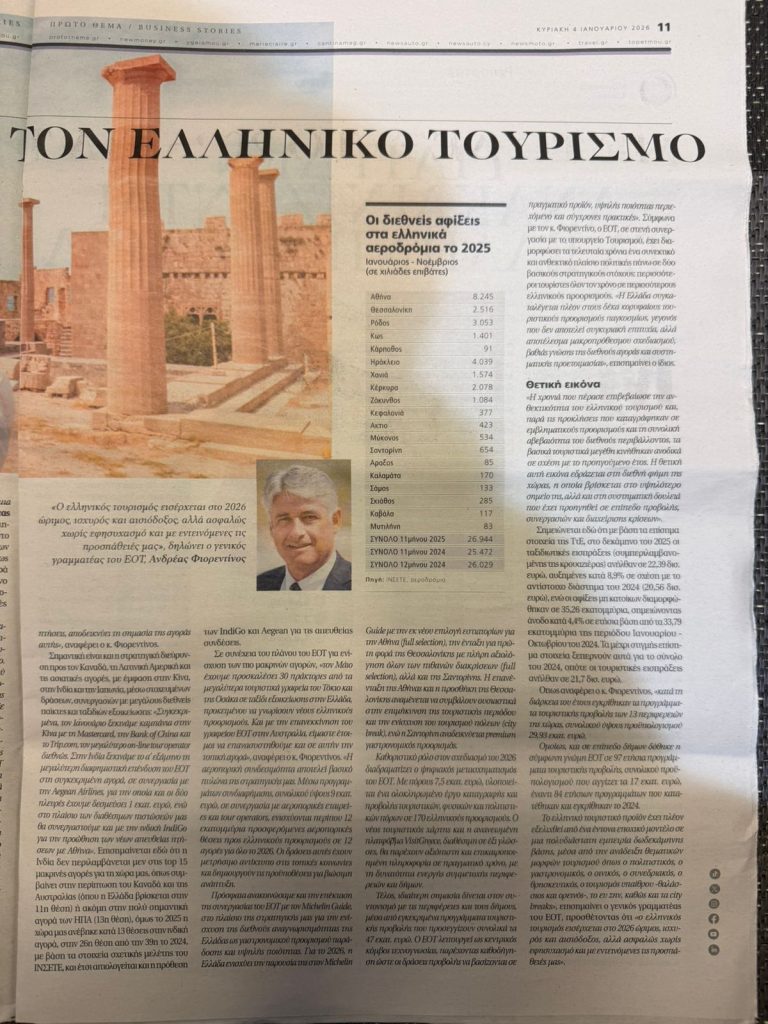 Ο Γενικός Γραμματέας του ΕΟΤ Ανδρέας Φιορεντίνος σε δήλωση του, στην εφημερίδα “Πρώτο Θέμα” σχετικά με τα πρώτα θετικά μηνύματα αλλά και για το πλάνο του 2026.