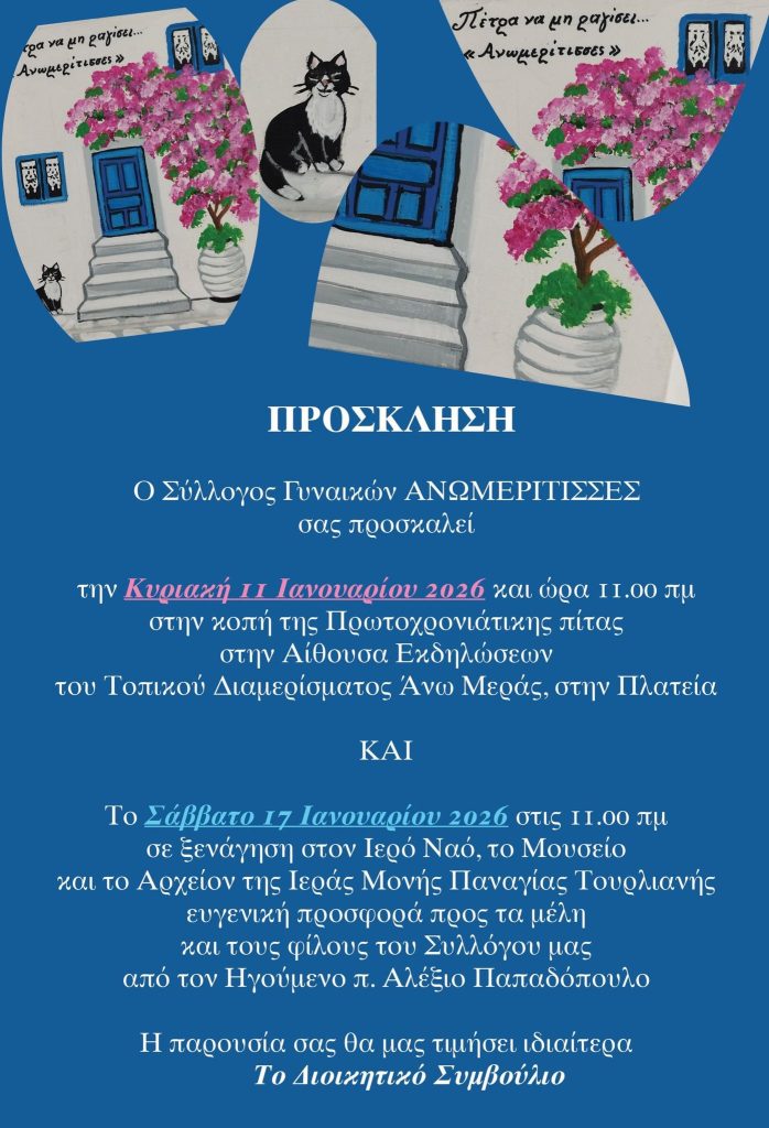 Ο Σύλλογος Γυναικών Μυκόνου “Ανωμερίτισσες” θα πραγματοποιήσουν την κοπή της Πρωτοχρονιάτικη Βασιλόπιτας την Κυριακή 11 Ιανουαρίου και ώρα ώρα 11:00.
