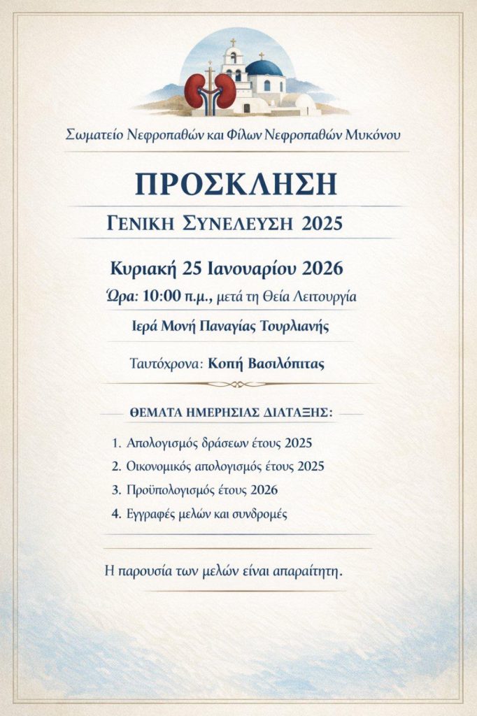 Το Σωματείο Νεφροπαθών και Φίλων Νεφροπαθών Μυκόνου την Κυριακή 25/01/2026 θα πραγματοποιήσει γενική συνέλευση στην Ιερά Μονή Παναγίας Τουρλιανής, καθώς επίσης θα γίνει και κοπή της πρωτοχρονιάτικης Αγιοβασιλόπιτας.