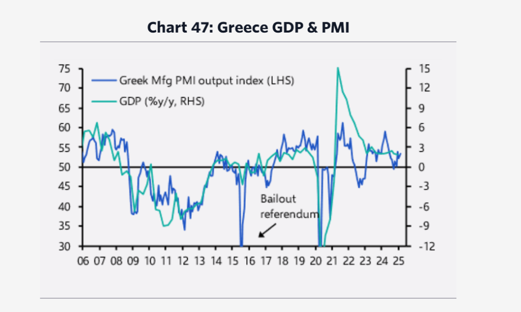 Το ΑΕΠ αυξήθηκε κατά 0,9% σε τριμηνιαία βάση (q/q) το 4ο τρίμηνο, ξεπερνώντας σημαντικά τις οικονομίες του «πυρήνα». Η περιορισμένη έκθεση της Ελλάδας στη ζήτηση από τις ΗΠΑ υποδηλώνει ότι οι δασμοί του Τραμπ θα επηρεάσουν ελάχιστα την οικονομία της. Οι έρευνες για τις επιχειρήσεις δείχνουν σταθερή ανάπτυξη στο εγγύς μέλλον.