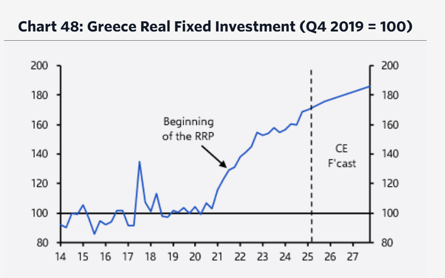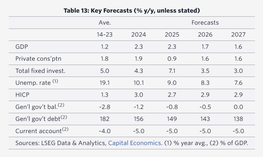 Η Ελλάδα θα παραμείνει σε ανοδική τροχιά και θα υπεραποδώσει της ευρύτερης οικονομίας της ευρωζώνης τα επόμενα χρόνια, υποστηριζόμενη από τη σταθερά βελτιούμενη δημοσιονομική της θέση, εκτιμά η Capital Economics. H ανάπτυξη στην Ελλάδα θα διαμορφωθεί στο 2,3% φέτος, στο 1,7% το 2026 και στο 1,6% το 2027 (έναντι 0,9%, 1,2% και 1% για την ευρωζώνη, αντίστοιχα).