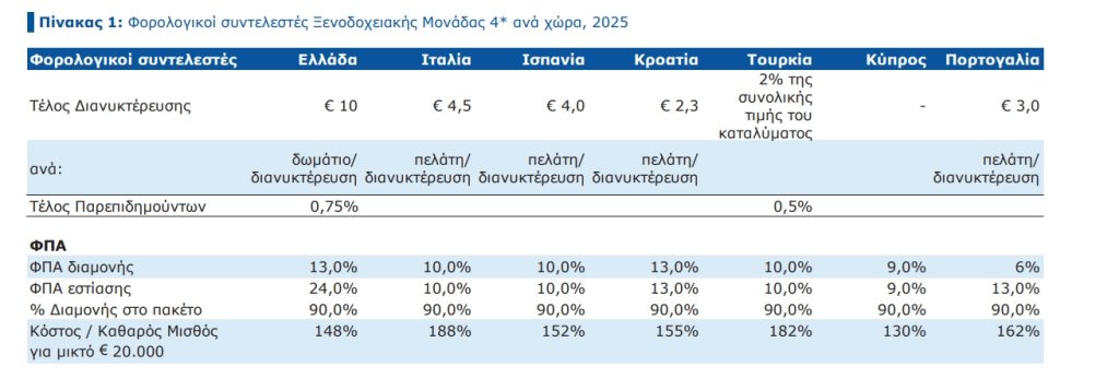 Ακόμη και αν στόχος είναι η ίδια καθαρή αμοιβή για τον εργαζόμενο, η τιμή δωματίου στην Ελλάδα θα έπρεπε να είναι €171, έναντι €150 στην Κύπρο. Το συνολικό ύψος φόρων και μη μισθολογικού κόστους στην Ελλάδα (€44,7 ανά διανυκτέρευση) είναι σχεδόν διπλάσιο σε σχέση με την Κύπρο (€24,1).