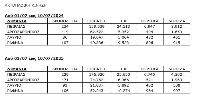 Σύμφωνα με στοιχεία του Υπουργείου Ναυτιλίας, στο πρώτο δεκαήμερο του Ιουλίου (1–10/7), η επιβατική και μεταφορική κίνηση από τα τρία βασικά λιμάνια της Αττικής (Πειραιάς, Λαύριο, Ραφήνα) κατέγραψε αύξηση 11,96% σε σύγκριση με την αντίστοιχη περίοδο του 2024. Συνολικά, διακινήθηκαν 325.768 επιβάτες έναντι 290.944 πέρυσι.