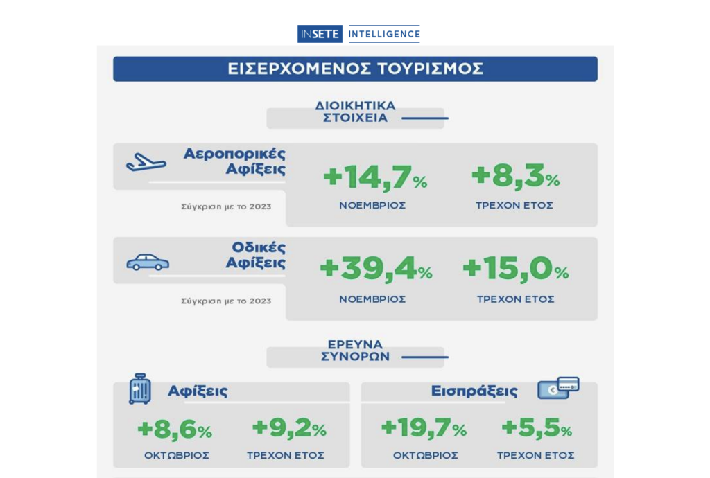 Οσον αφορά ειδικά το κομμάτι των αφίξεων από το εξωτερικό, με βάση τα στοιχεία που συγκεντρώνει το Ινστιτούτο του Συνδέσμου Ελληνικών Τουριστικών Επιχειρήσεων (ΙΝΣΕΤΕ), την περίοδο Ιανουαρίου- Νοεμβρίου διαμορφώθηκαν στο σύνολό τους, αεροπορικές και οδικές, στα 36,87 εκατ. από 33,47 εκατ. την αντίστοιχη περίοδο του 2023, σημειώνοντας αύξηση κατά 10,1%. Από αυτές τα 25,5 εκατ. αντιστοιχούν στις διεθνείς αεροπορικές αφίξεις και οι υπόλοιπες -11,44 εκατ.- στις οδικές.