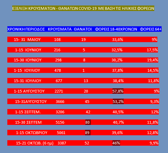 Ενδεικτική είναι, σύμφωνα με τον αναλυτικό πίνακα του «Βήματος», η αύξηση των κρουσμάτων και των θανάτων σε συνάρτηση με την ηλικία των φορέων, η οποία παρατηρείται μετά τις αρχές Αυγούστου.
