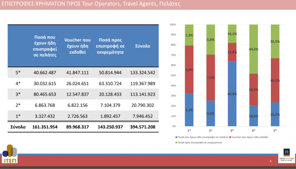 Συγκεκριμένα, έχουν ήδη επιστρέψει σε tour operators, travel agents και πελάτες 161.351.954 ευρώ, έχουν ήδη εκδώσει vouchers συνολικής αξίας 89.968.317 ευρώ και παραμένουν σε εκκρεμότητα επιστροφές που φτάνουν τα 143.250.937 ευρώ. Το αθροιζόμενο ποσό μόνο για τις υποχρεώσεις αυτής της κατηγορίας φτάνει τα 394.571.208 ευρώ.