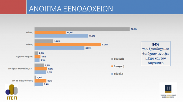 Ειδικότερα, τα συνεχούς λειτουργίας ξενοδοχεία που έχουν ήδη ανοίξει ή πρόκειται ν’ ανοίξουν μέχρι και τον Αύγουστο ανέρχονται σε ποσοστό 90,7% του συνόλου, ενώ το αντίστοιχο ποσοστό για τα εποχικής λειτουργίας φτάνει το 80,5%.